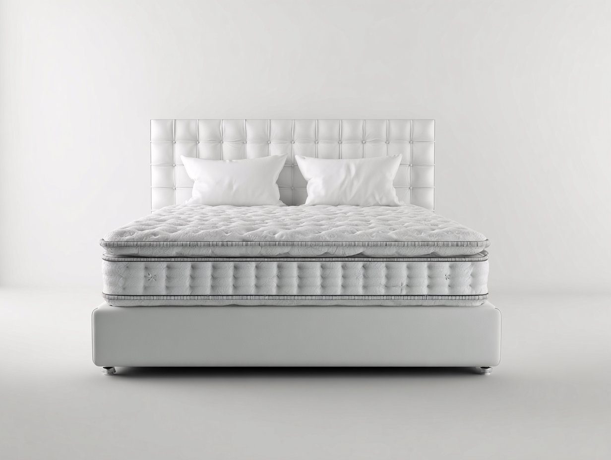 Letto matrimoniale moderno con rivestimento chiaro, pensato per ambienti luminosi e contemporanei.